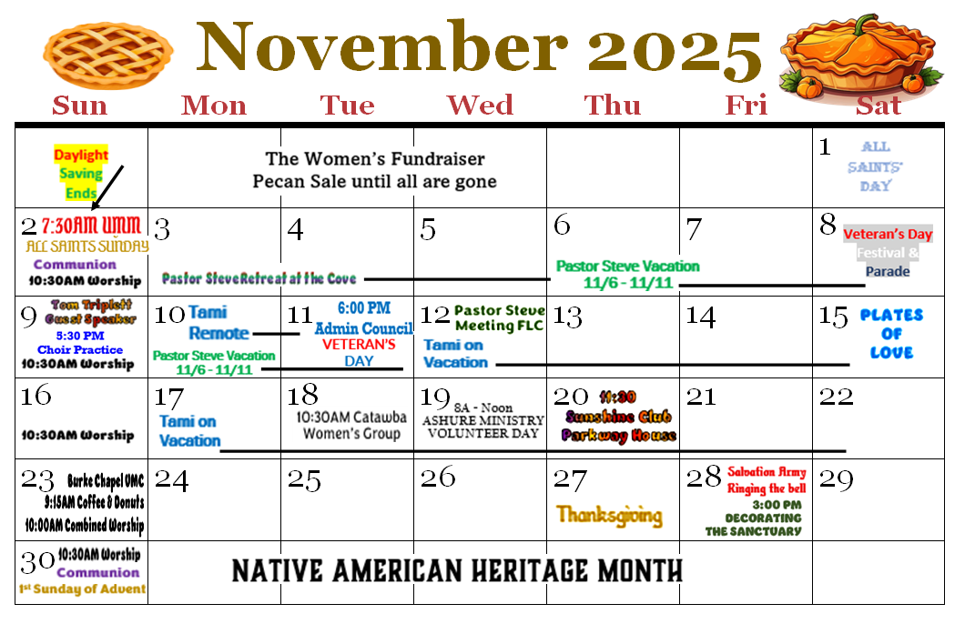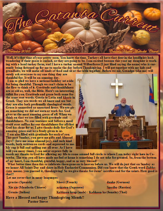 Our Plates of Love ministry will deliver meals on Saturday, November 15th. Please let us know if you live in the town of Catawba and would like to receive a meal.